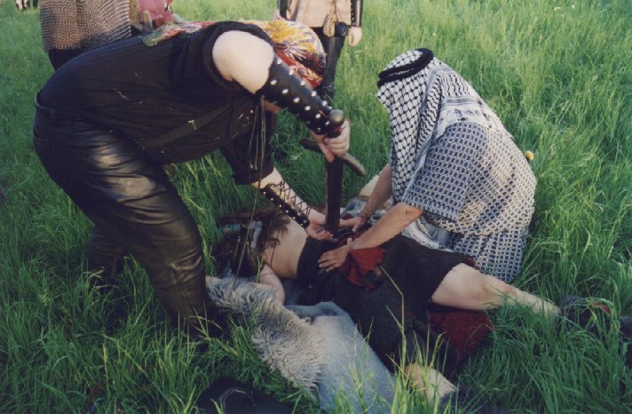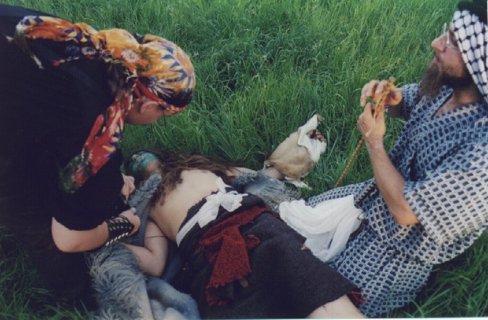 Den Anführer der Orkenbande hat man auch schwer verletzt gefunden. Man versucht ihm die Pfeilspitze aus den Leib zu holen.